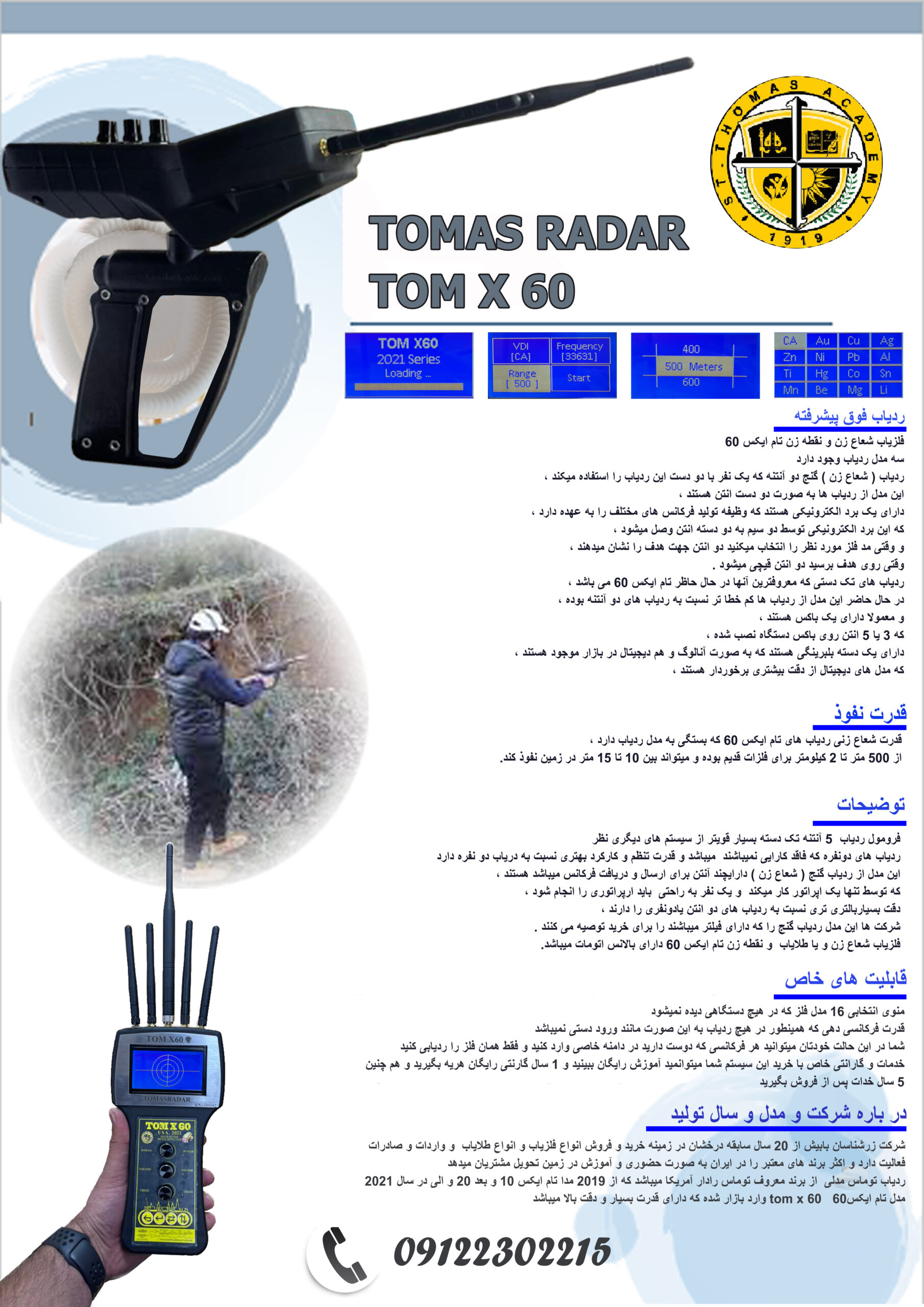 شرکت زرشناسان بابیش از 20 سال سابقه درخشان در زمینه خرید و فروش انواع فلزیاب و انواع طلایاب و واردات و صادرات فعالیت دارد و اکثر برند های معتبر را در ایران به صورت حضوری و آموزش در زمین تحویل مشتریان میدهد ردیاب توماس مدلی از برند معروف توماس رادار آمریکا میباشد که از 2019 مدا تام ایکس 10 و بعد 20 و الی در سال 2021 مدل تام ایکس60 tom x 60 وارد بازار شده که دارای قدرت بسیار و دقت بالا میباشد.